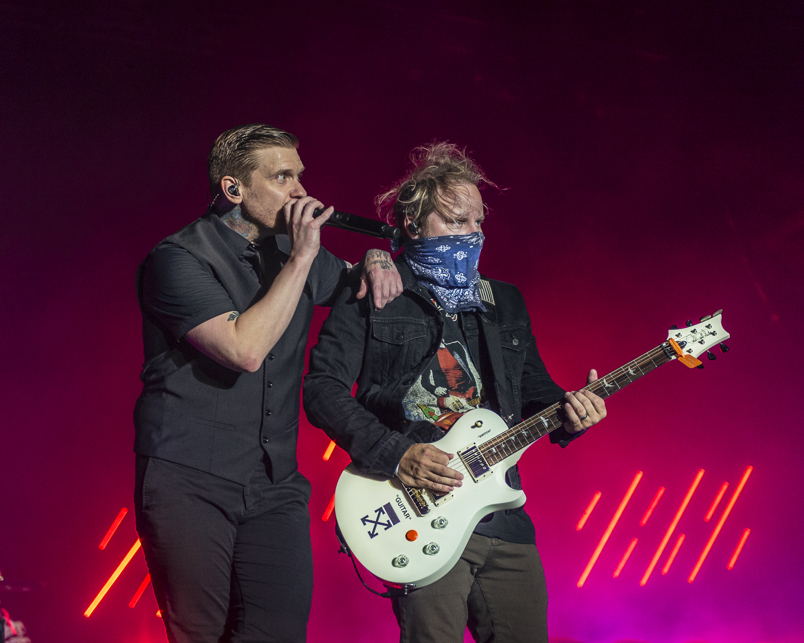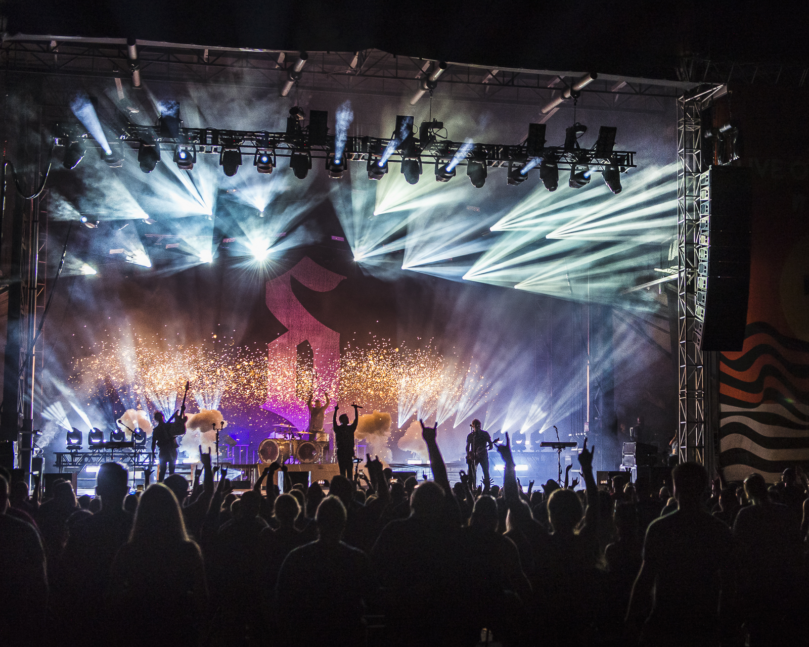 While standing in a line that wrapped from the KCF Yum Center to the Tumbleweed on River Rd I heard the crowd roar and live music starting to play. Anxiety set in while looking at the ¾ of a mile line in front of me. Thankfully the show was perfectly placed. The acoustics of the overpass acted as an amplifier. Allowing those waiting in line to enjoy the music from afar. After the first few songs we all became confused, this wasn’t Pop Evil. Whoever was on the stage had the audience captured. The vocalist has smooth rap beats and an impeccable singing range. I racked my brain trying to connect the dots. Finally, I heard the beginnings of a song I have been loving on SiriusXM Octane “Adrenaline”. Zero 9:36 was the mystery band. I could see the stage from the line and could tell the energy brought was simply amazing. The crowd both in and outside of the gates were all rocking along with the hit song. Sadly, Zero 9:36 left the stage before I made it through the gates. From what I saw and heard this is a band you’ll want to make sure you see live! Follow them over at zero936.com. I did learn their setlist that night was: