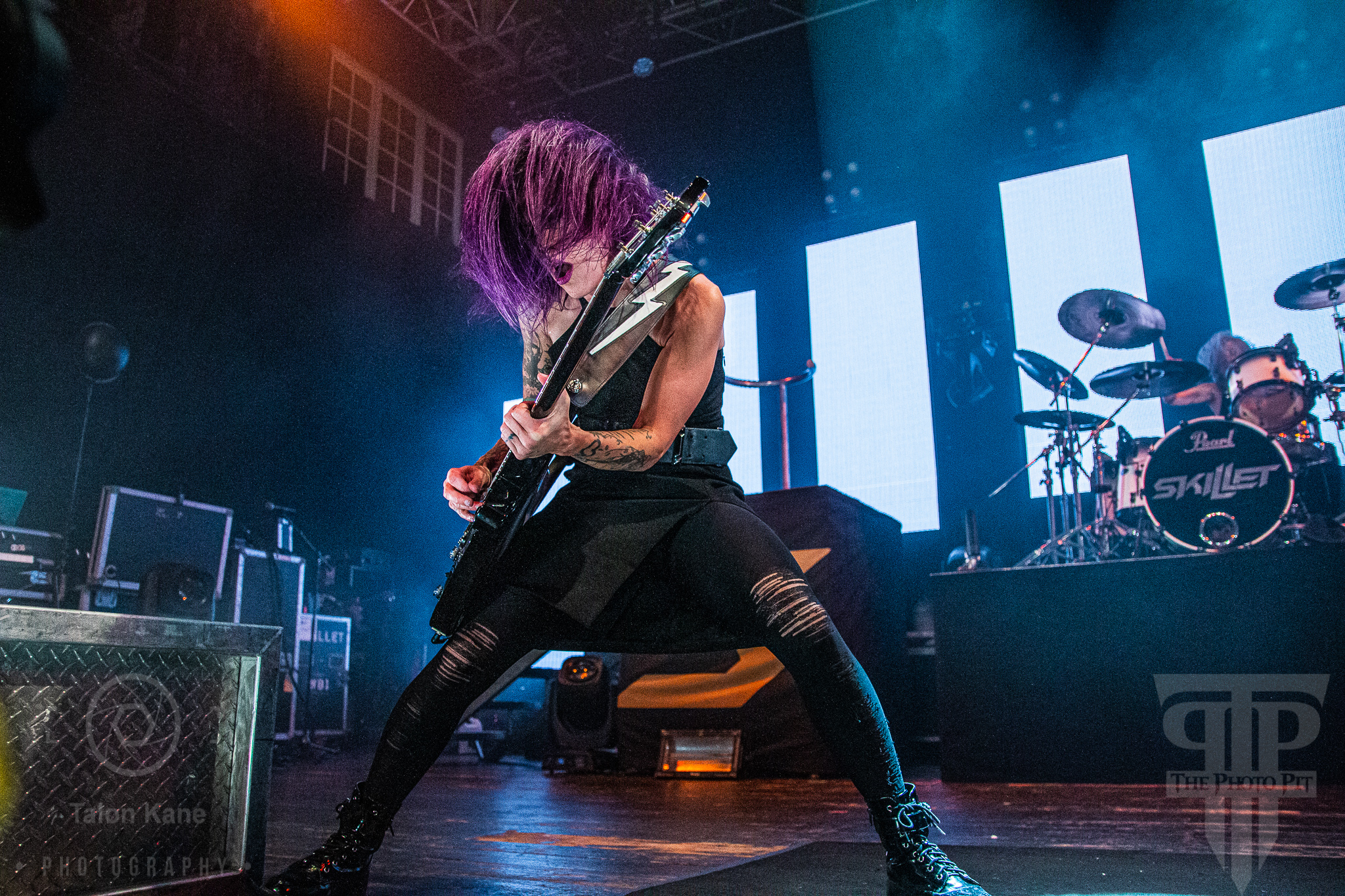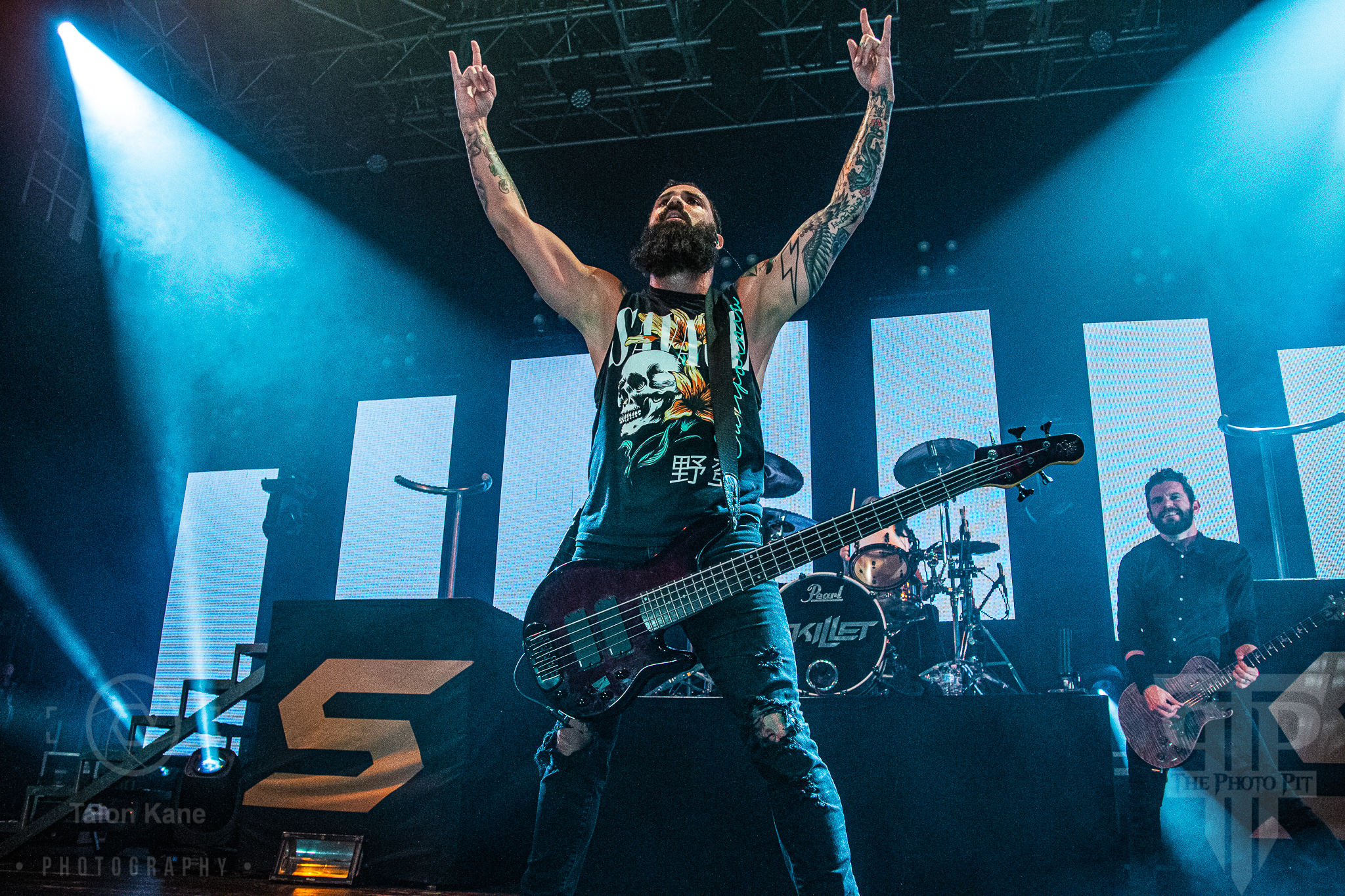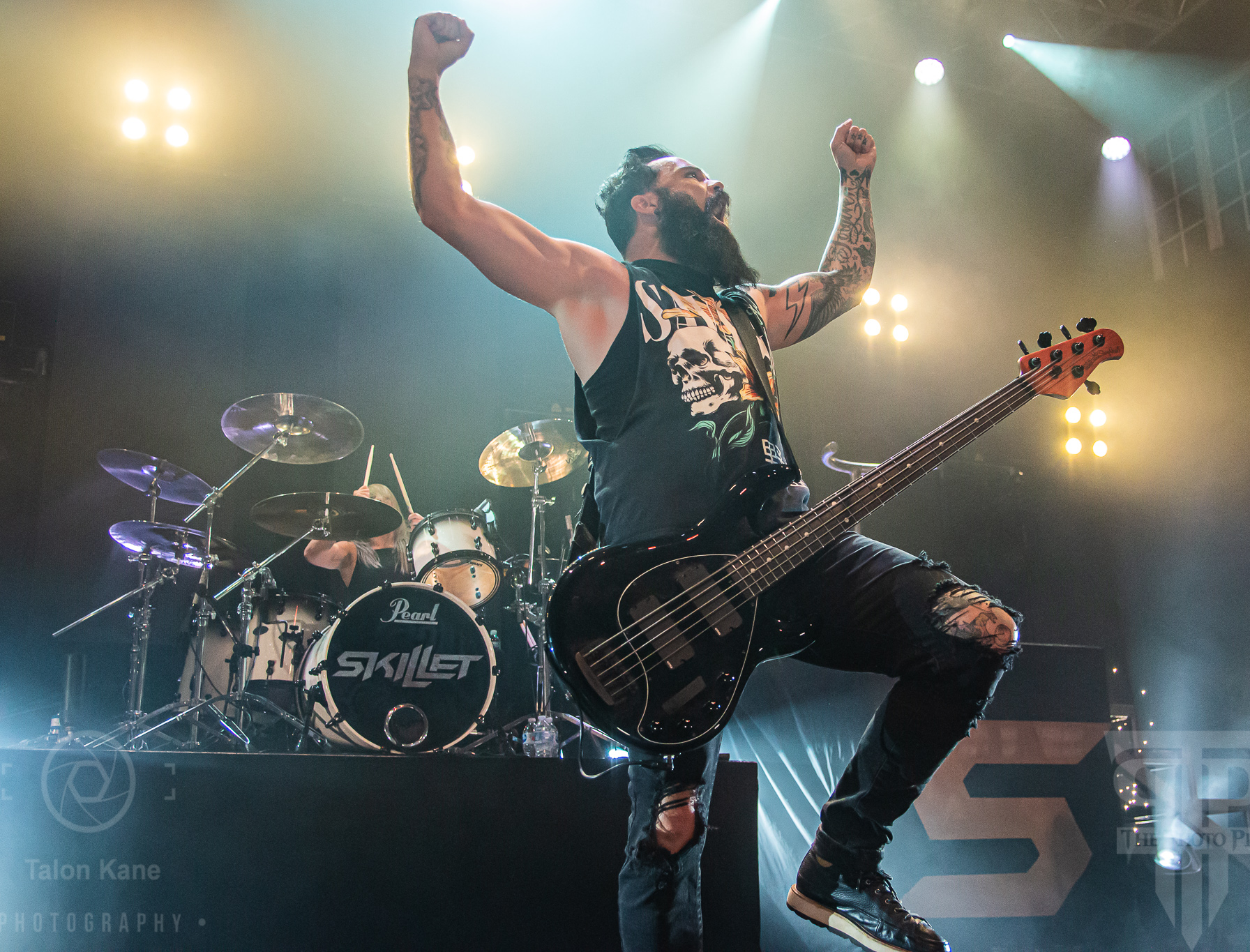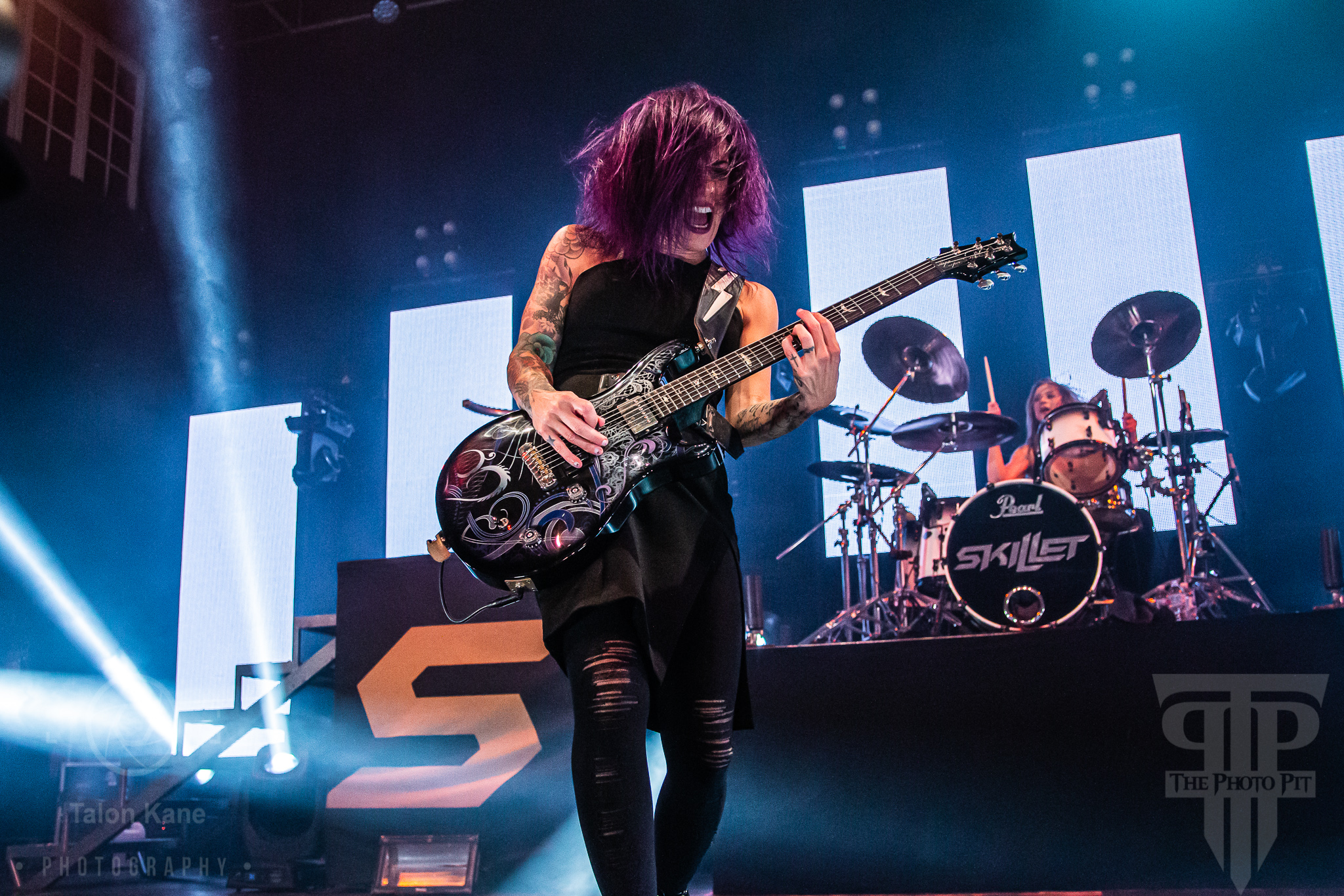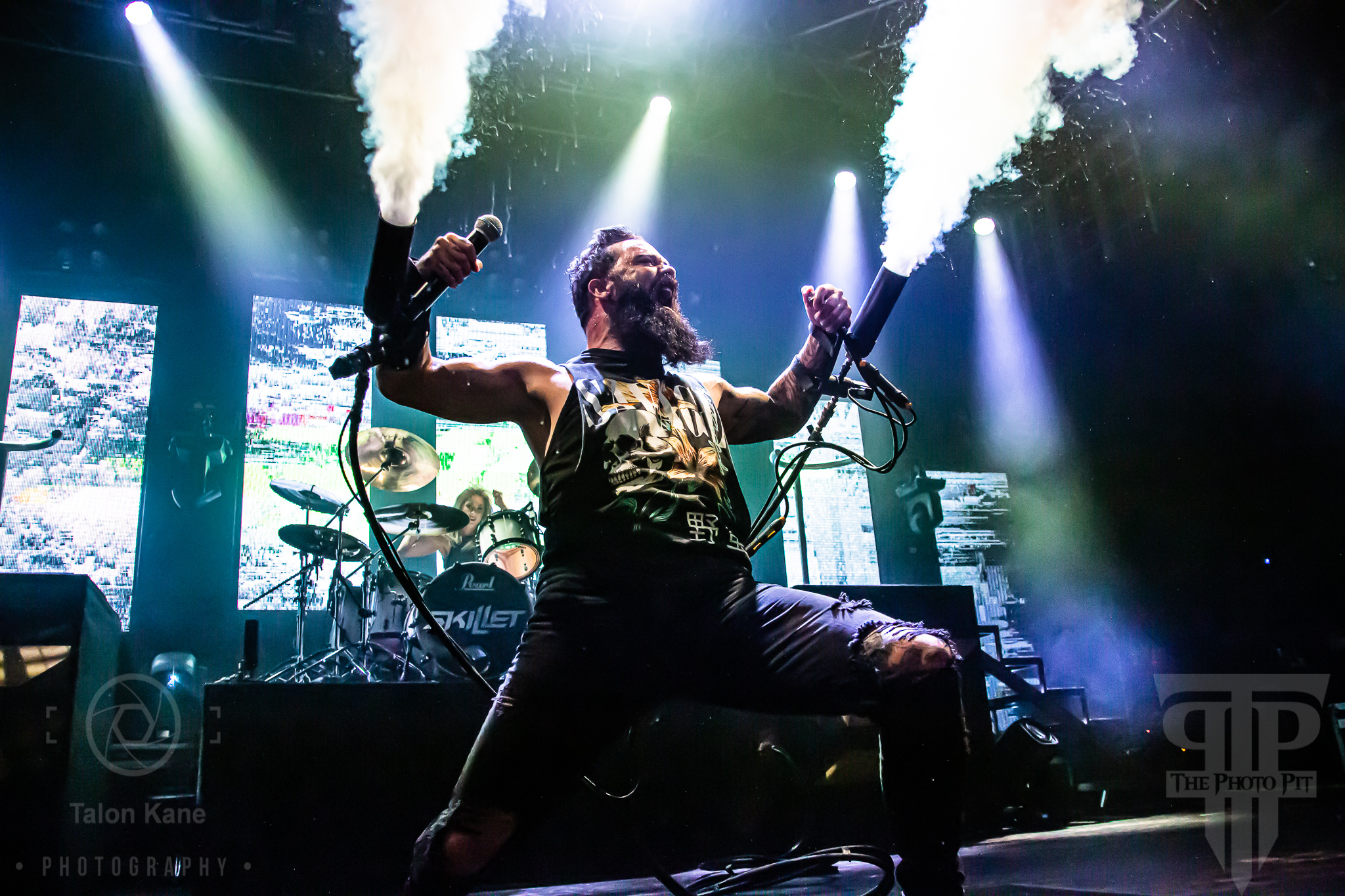 Before they came to the stage, radio hosts Supa Dave and Pat Lynch from WJRR 101.1 Orlando’s rock station came out to talk to the crowd. They had an opportunity for fans to get their hands on a Skillet skillet (literally a frying pan autographed by the band) via raffle where the money was going to charity. Soon after, Skillet took the stage to one of the loudest crowds I’ve heard yet at House of Blues Orlando. Skillet loves to kick off a show fast and did say with “Feel Invincible” from their album Unleashed. If you ever want to see and feel true energy come off a stage, Skillet is the forefront runner for it. The intensity and passion you see and hear from them are incredible. From John‘s amazing vocals to Korey‘s bouncing and even playing doing a split, to Seth‘s ripping guitar riffs, and Jen headbanging behind the drumset, they are the epitome of the word “energetic”. Honestly, it’s electric seeing them live. John brought out fog cannons attached to his arms to pepper us in the pit and the crowd with them. I always love seeing that and he seems to have way too much fun using them.
