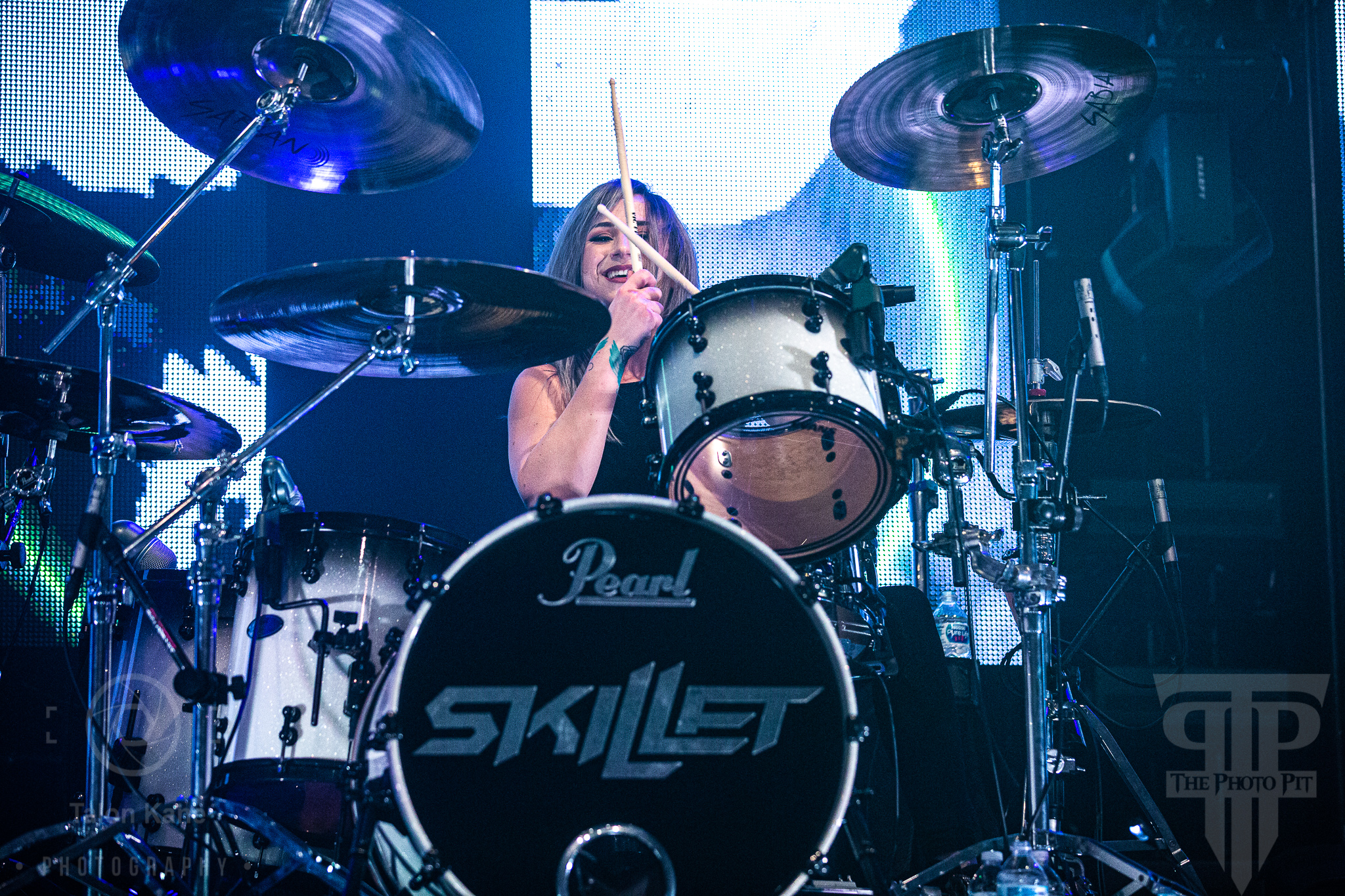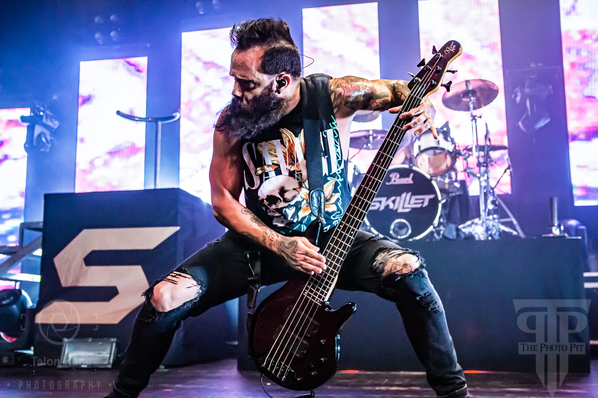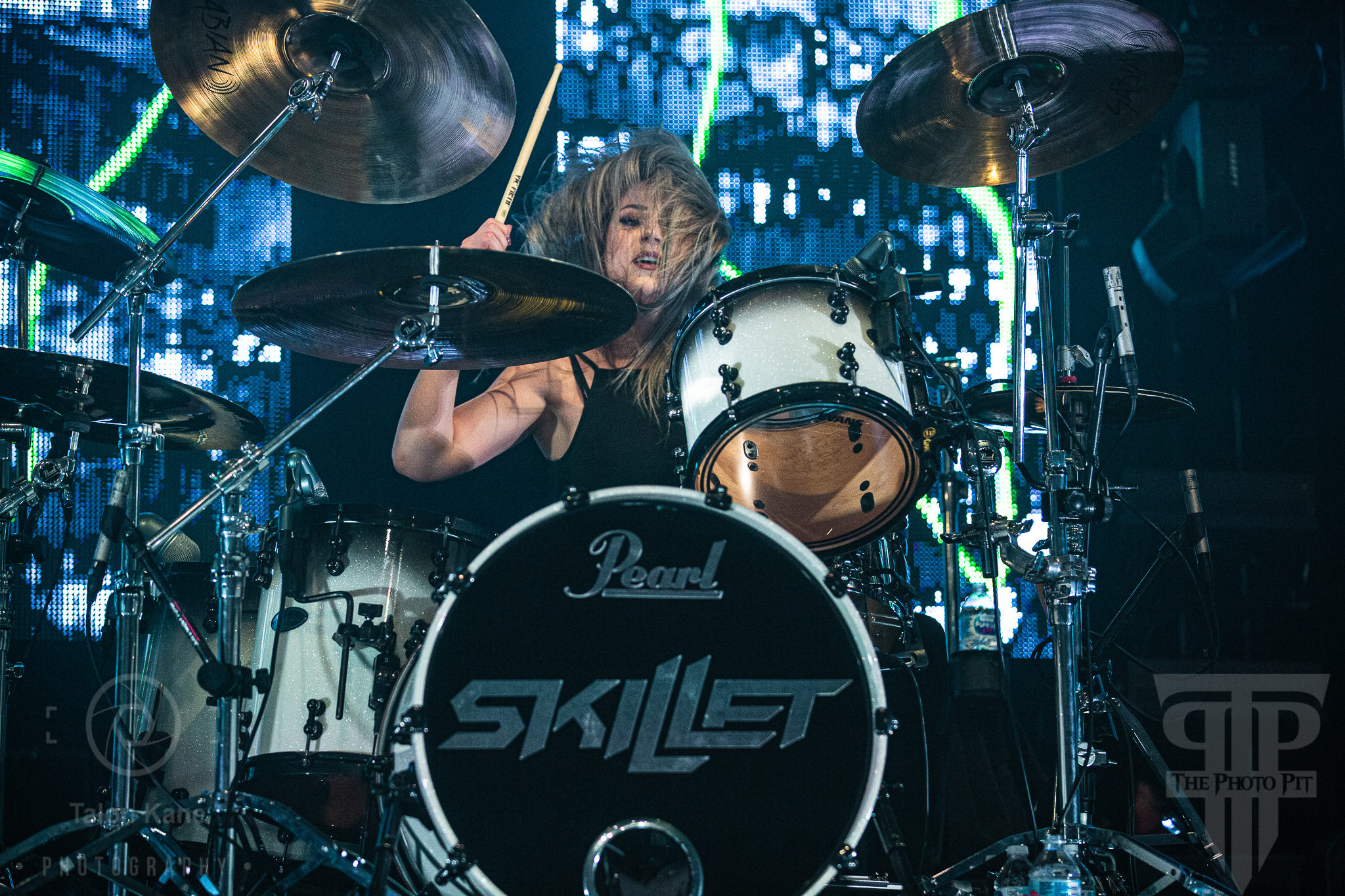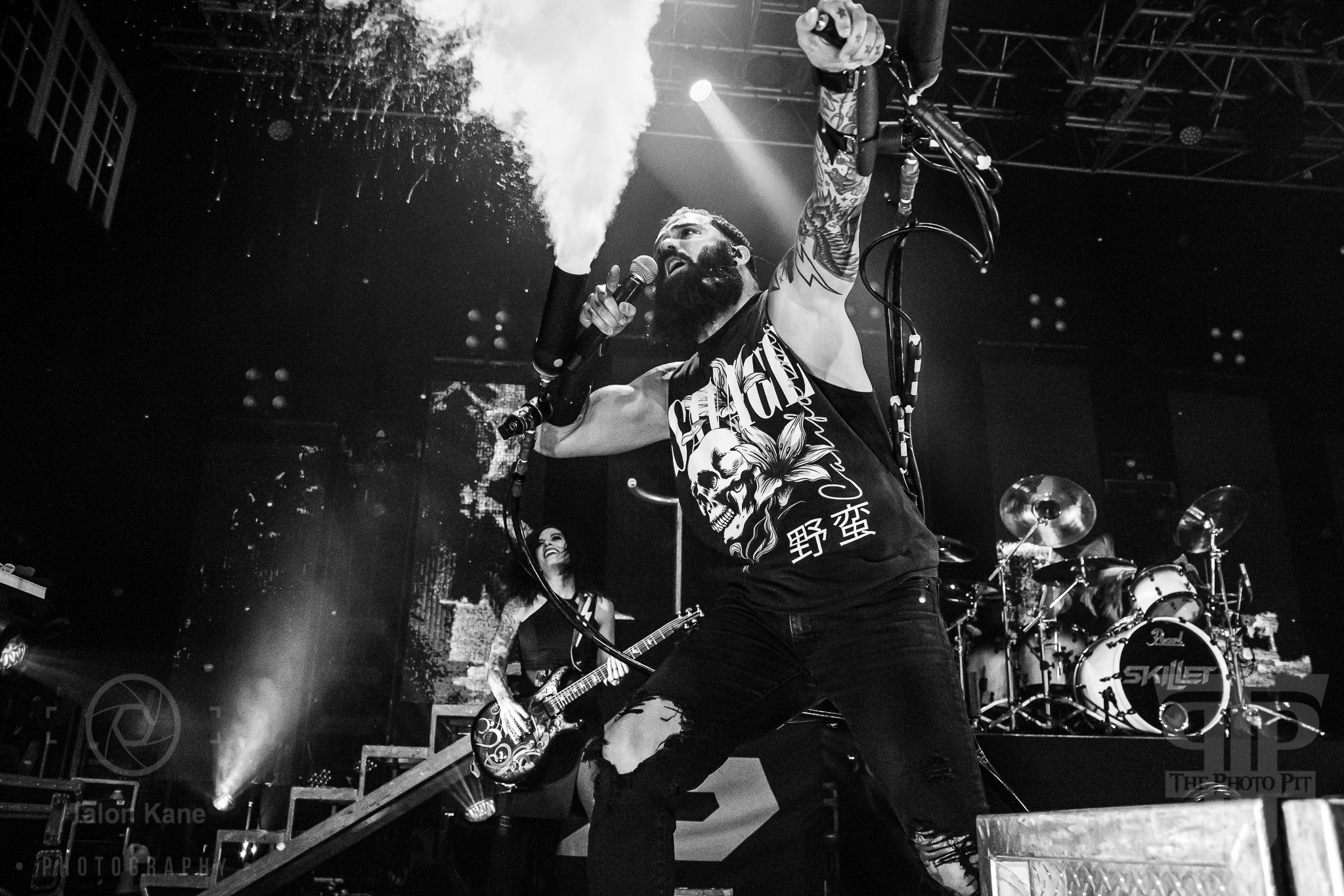 Before they came to the stage, radio hosts Supa Dave and Pat Lynch from WJRR 101.1 Orlando’s rock station came out to talk to the crowd. They had an opportunity for fans to get their hands on a Skillet skillet (literally a frying pan autographed by the band) via raffle where the money was going to charity. Soon after, Skillet took the stage to one of the loudest crowds I’ve heard yet at House of Blues Orlando. Skillet loves to kick off a show fast and did say with “Feel Invincible” from their album Unleashed. If you ever want to see and feel true energy come off a stage, Skillet is the forefront runner for it. The intensity and passion you see and hear from them are incredible. From John‘s amazing vocals to Korey‘s bouncing and even playing doing a split, to Seth‘s ripping guitar riffs, and Jen headbanging behind the drumset, they are the epitome of the word “energetic”. Honestly, it’s electric seeing them live. John brought out fog cannons attached to his arms to pepper us in the pit and the crowd with them. I always love seeing that and he seems to have way too much fun using them.
