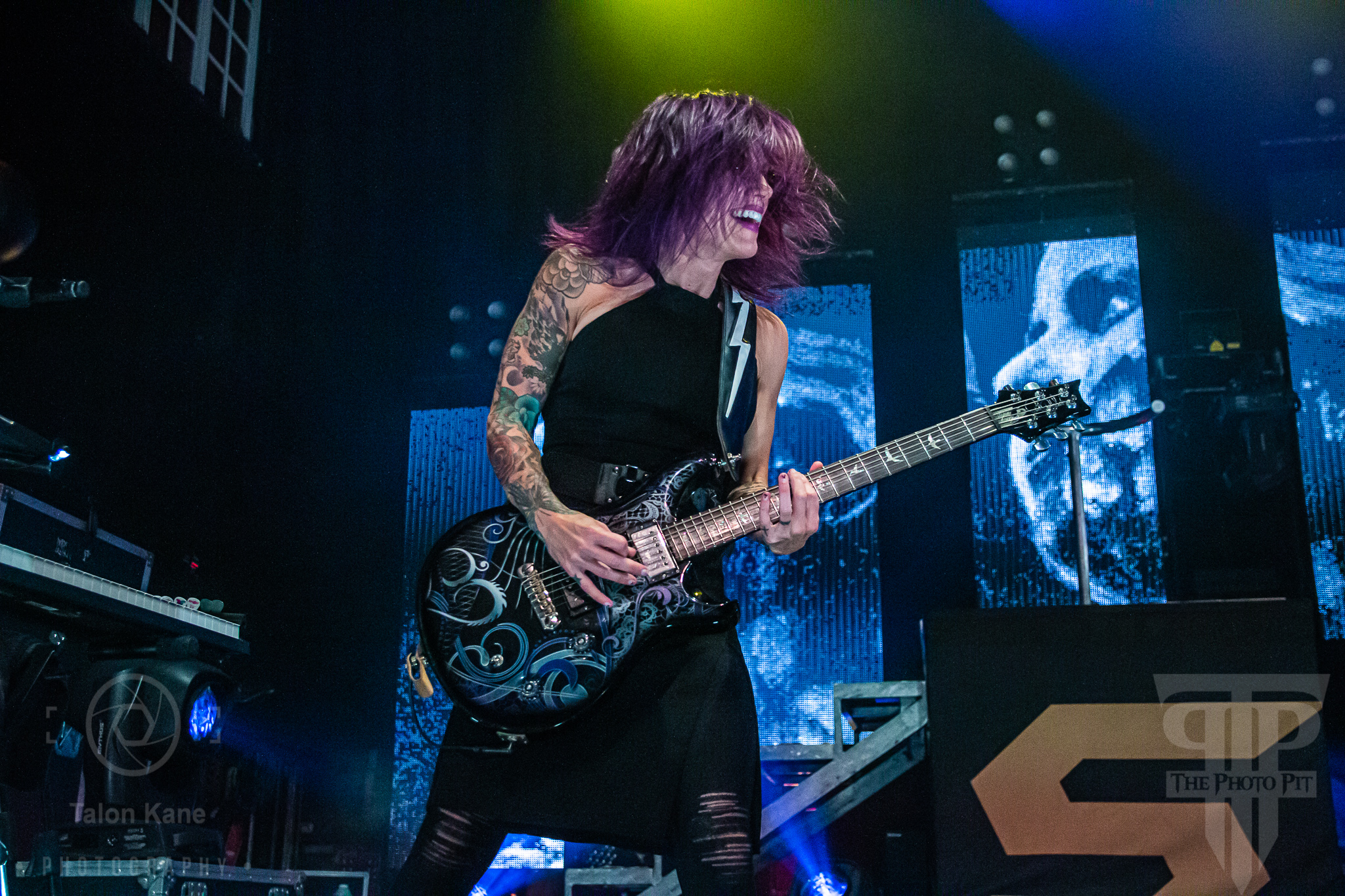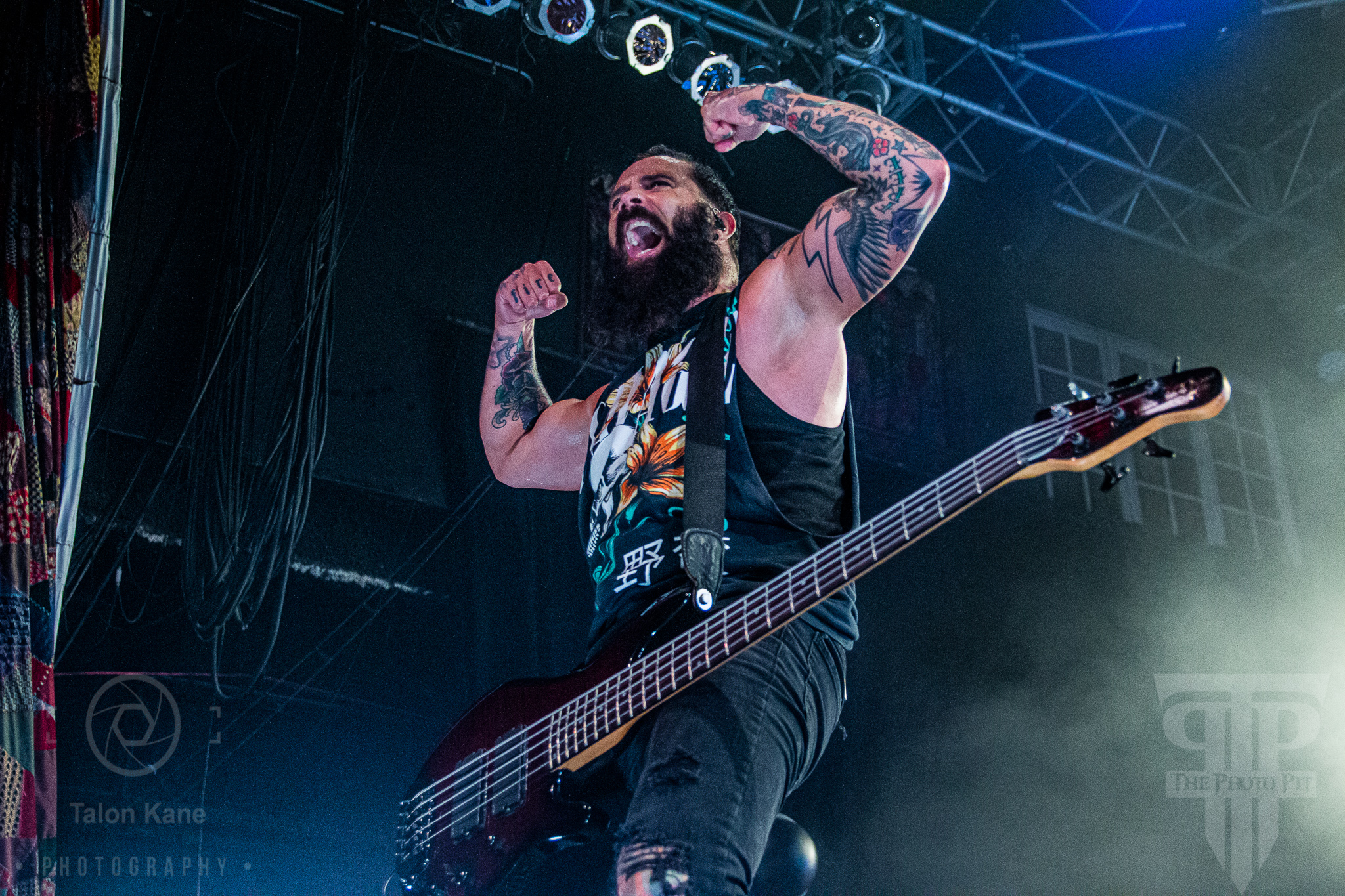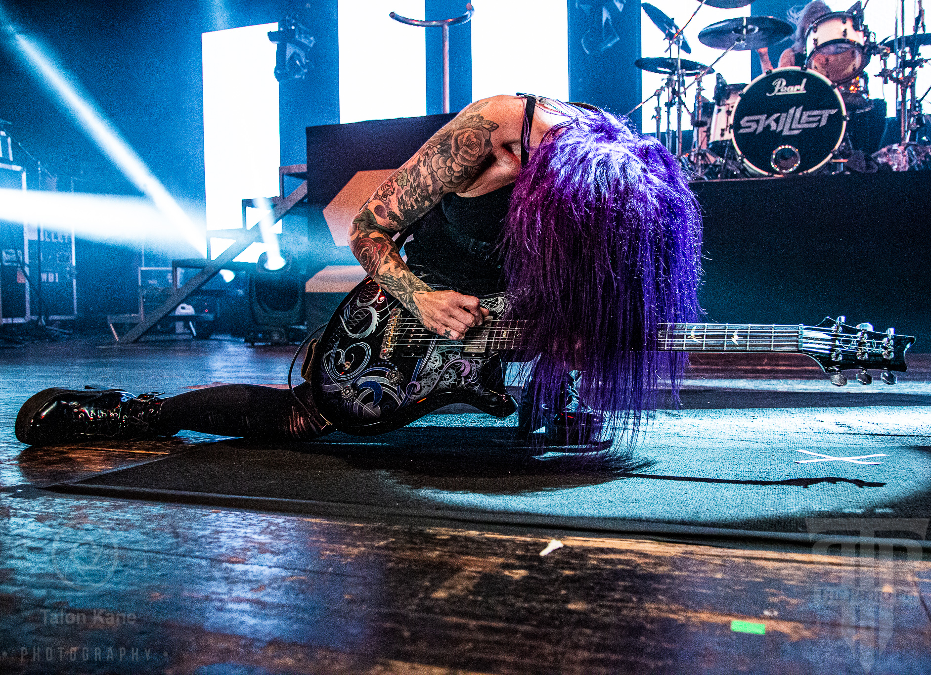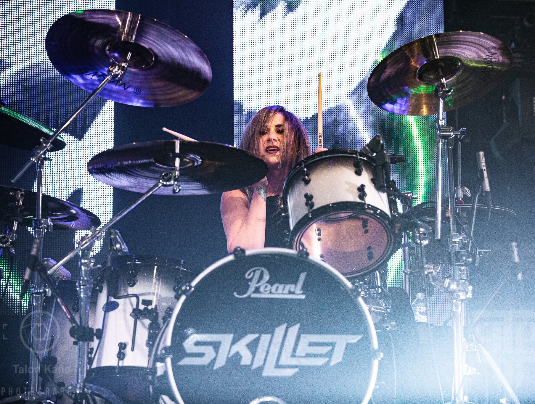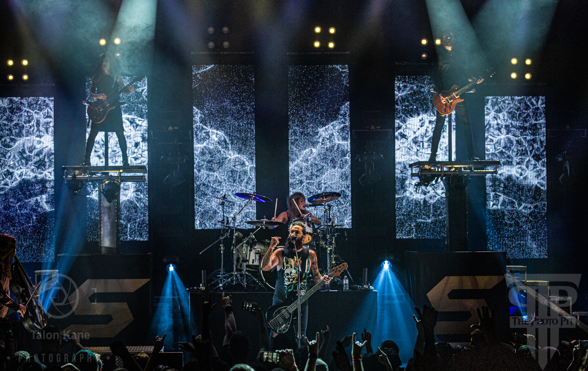 Before they came to the stage, radio hosts Supa Dave and Pat Lynch from WJRR 101.1 Orlando’s rock station came out to talk to the crowd. They had an opportunity for fans to get their hands on a Skillet skillet (literally a frying pan autographed by the band) via raffle where the money was going to charity. Soon after, Skillet took the stage to one of the loudest crowds I’ve heard yet at House of Blues Orlando. Skillet loves to kick off a show fast and did say with “Feel Invincible” from their album Unleashed. If you ever want to see and feel true energy come off a stage, Skillet is the forefront runner for it. The intensity and passion you see and hear from them are incredible. From John‘s amazing vocals to Korey‘s bouncing and even playing doing a split, to Seth‘s ripping guitar riffs, and Jen headbanging behind the drumset, they are the epitome of the word “energetic”. Honestly, it’s electric seeing them live. John brought out fog cannons attached to his arms to pepper us in the pit and the crowd with them. I always love seeing that and he seems to have way too much fun using them.