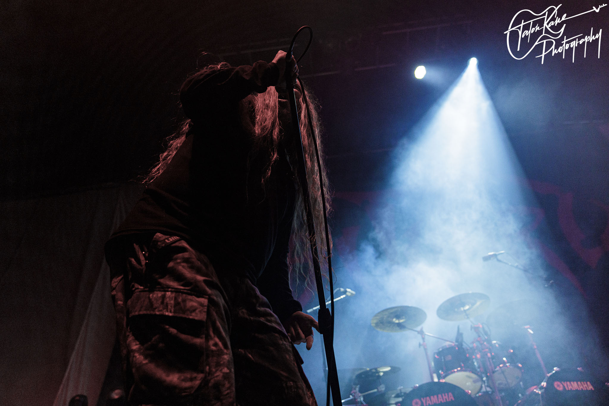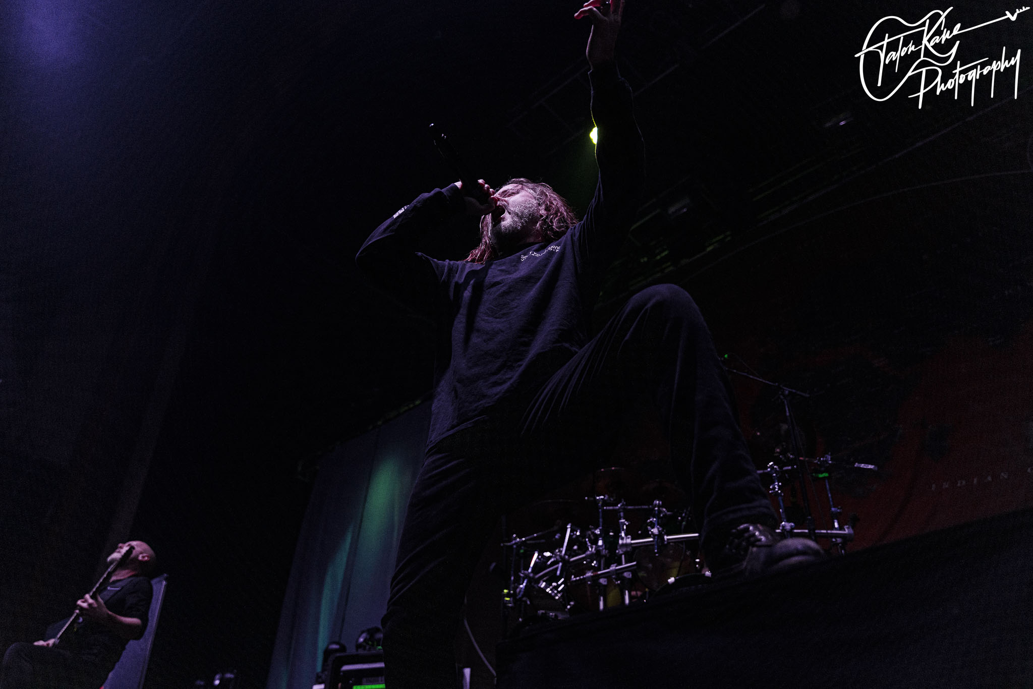 The first band to the stage was Cattle Decapitation from San Diego, CA. The band started in 1996 and has released seven studio albums with their last one Death Atlas released in 2019. Their music has been known for songs on the mistreatment of animals, animal rights, and human impact on the environment. The band consists of Travis Ryan (vocals), Josh Elmore (lead guitar), Dave McGraw (drums), Belisario Dimuzio (rhythm guitar), and Olivier Pinard (bass).