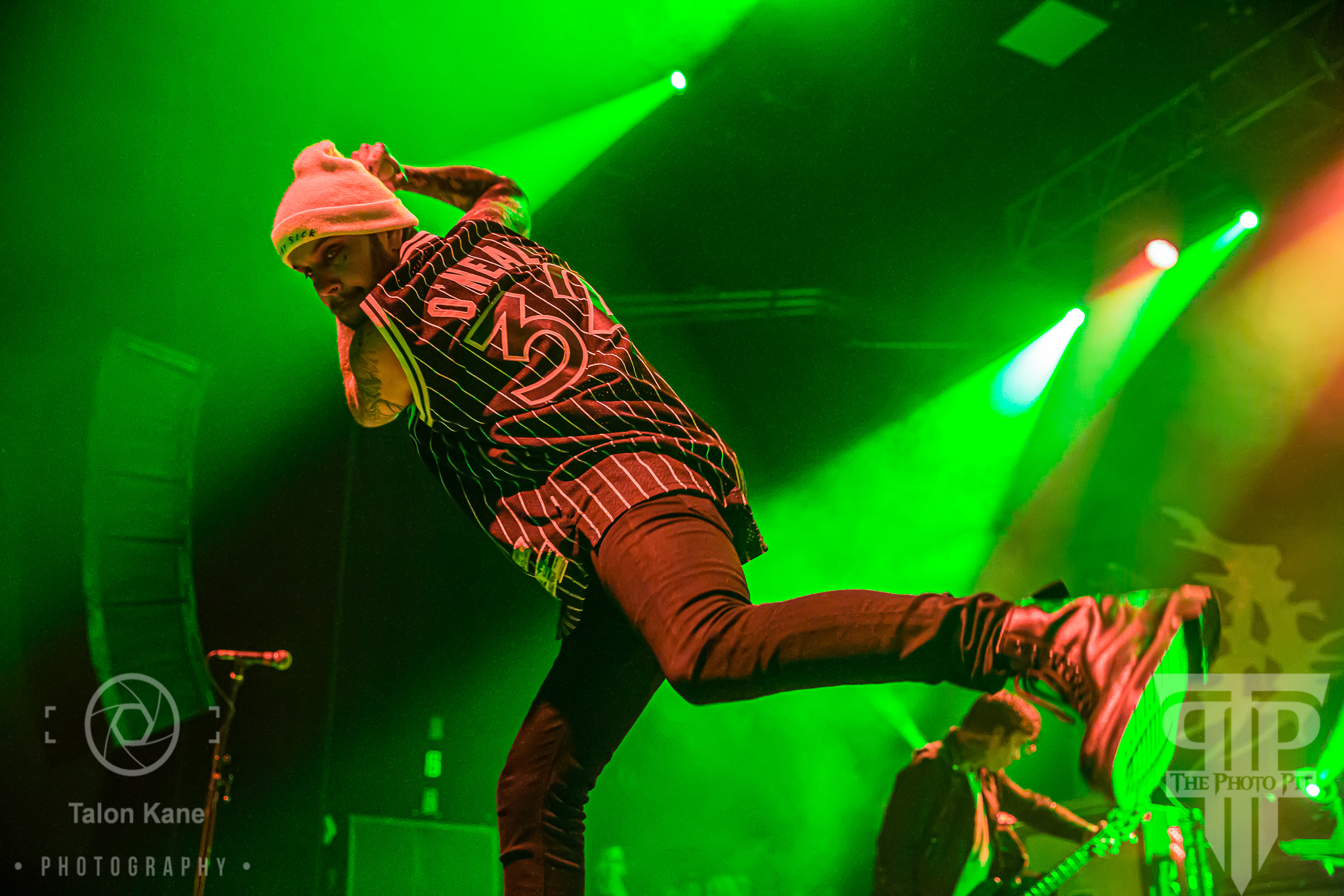 As usual for an Attila show, Fronz asked the ladies to throw their bras up on the stage so they can hang them on the mic stand. Halfway through the show, he noticed there weren’t many bras thrown onto the stage. He started to ask why and then said, “Oh, it’s because you ladies aren’t wearing bras”, which raised cheers from the crowd. Before performing “Pizza” Fronz called up a woman on stage. She was topless and had pizza stickers over her nipples. She stayed on stage to dance and sing with Fronz which led to huge cheers from the crowd. And right before they wrapped up with “Toxic”, Fronz separated out the moshers to the left and right and had them run at each other. It was the largest mosh pit of the evening and it was utter chaos. Fronz thanked the crowd and the band said goodnight throwing out guitar picks and drumsticks. Also, I learned there were multiple injuries from the mosh pit during their set. You can find more on Attila at their website HERE and see a full gallery of photos from their performance HERE.