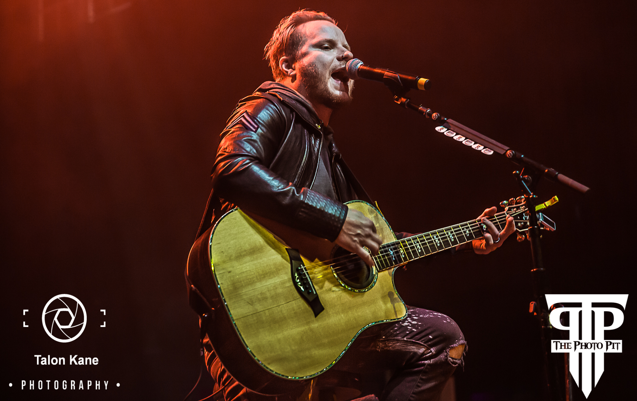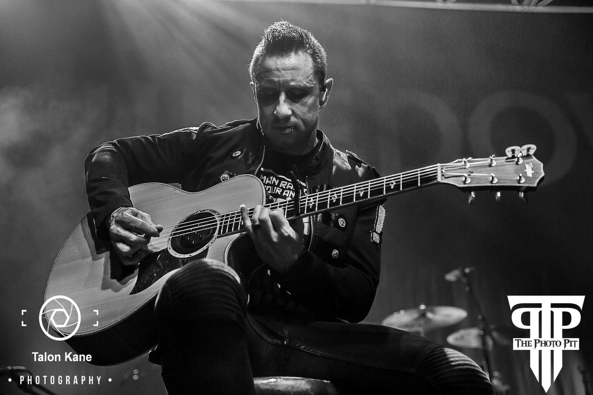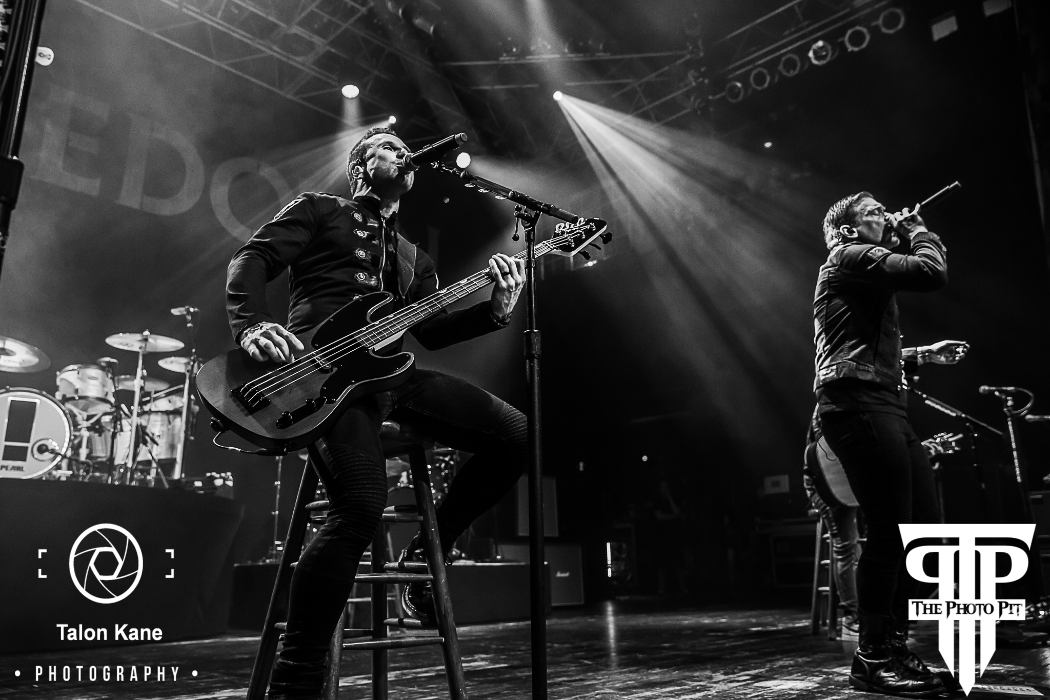 In the months leading up to the show, there was a ton of speculation as to what Shinedown would include in these shows. After Thursday’s show, we had heard rumors in the venue Shinedown would perform an acoustic set on Friday. That turned out to be true. Brent Smith (vocals), Zach Myers (guitar), Eric Bass (bass), and Barry Kerch (drums) made their way to the stage all wearing matching dark blue jackets with the ‘Attention Attention’ exclamation point embroidered on the left sleeve. Barry manned a much smaller drum set and Zach walked out with an acoustic guitar in hand. Zach and Eric made themselves comfortable on stools while Brent pulled his away opting to stand while he sang. They decided to go back to true old school Shinedown kicking it off with “Fly From The Inside” the band’s very first single off their first album ‘Leave a Whisper’. I’ve never heard the song played this way and absolutely loved it. I could already see we were in for something truly special tonight. They followed with “Unity” from the 2012 album ‘Amaryllis’.