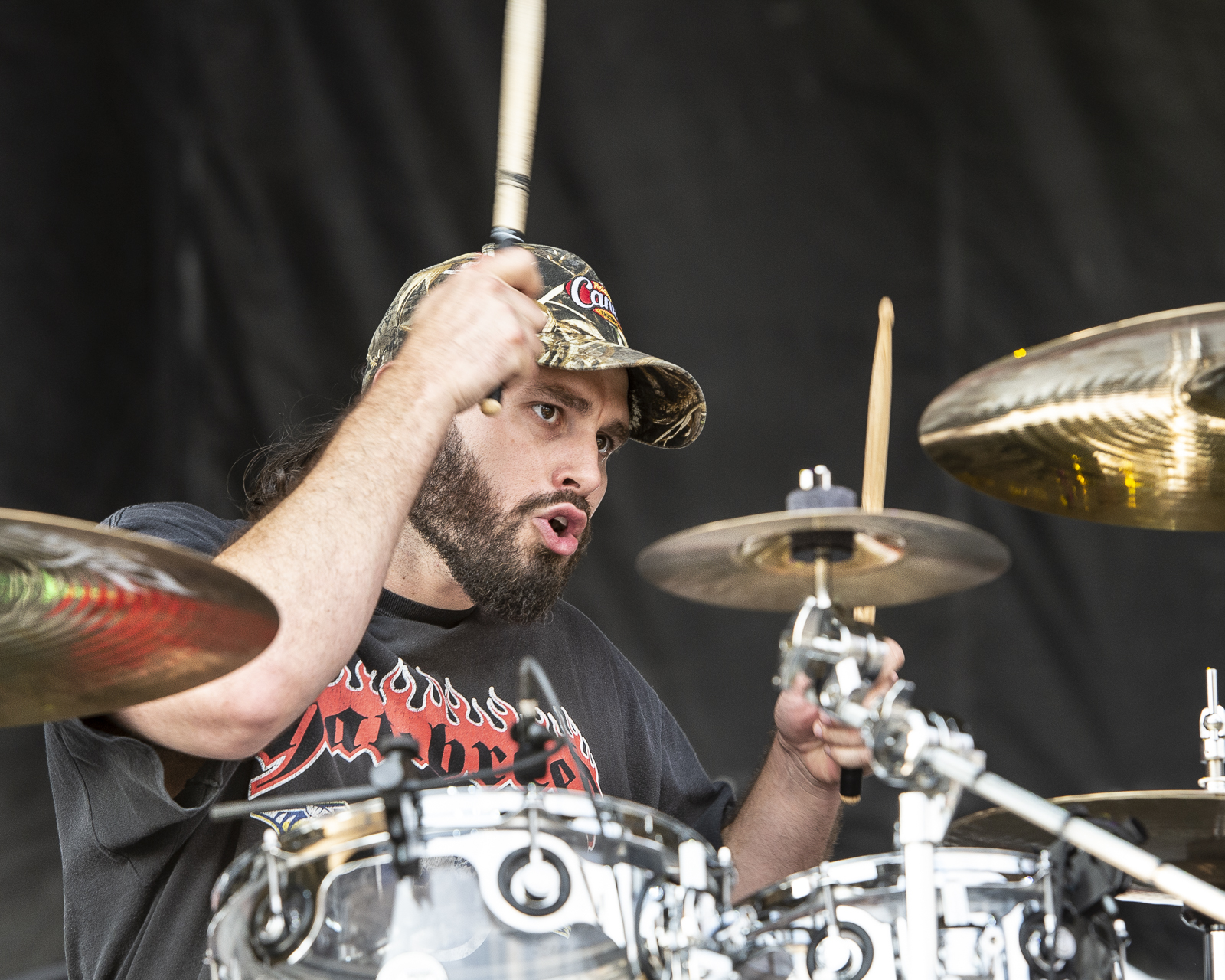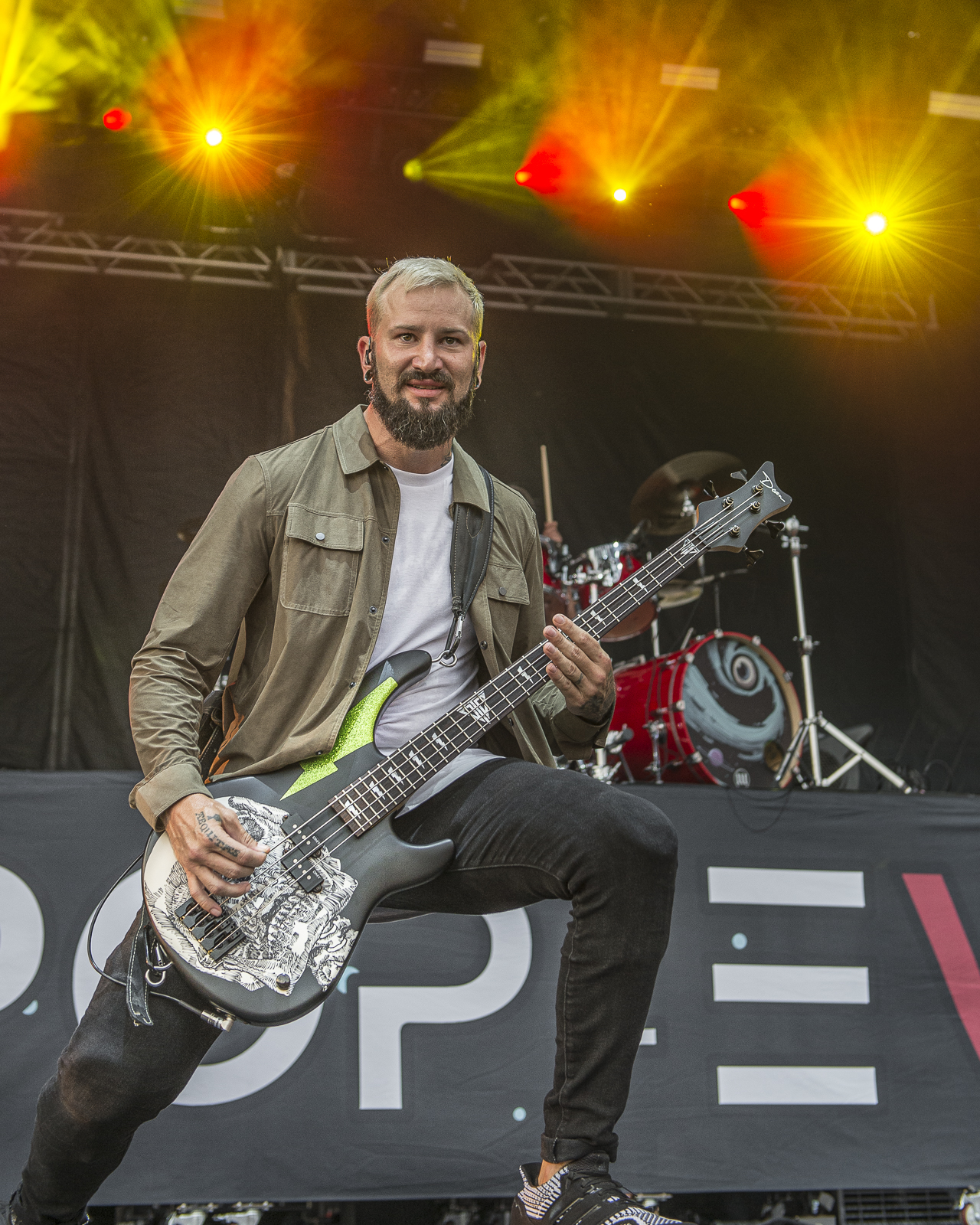 While standing in a line that wrapped from the KCF Yum Center to the Tumbleweed on River Rd I heard the crowd roar and live music starting to play. Anxiety set in while looking at the ¾ of a mile line in front of me. Thankfully the show was perfectly placed. The acoustics of the overpass acted as an amplifier. Allowing those waiting in line to enjoy the music from afar. After the first few songs we all became confused, this wasn’t Pop Evil. Whoever was on the stage had the audience captured. The vocalist has smooth rap beats and an impeccable singing range. I racked my brain trying to connect the dots. Finally, I heard the beginnings of a song I have been loving on SiriusXM Octane “Adrenaline”. Zero 9:36 was the mystery band. I could see the stage from the line and could tell the energy brought was simply amazing. The crowd both in and outside of the gates were all rocking along with the hit song. Sadly, Zero 9:36 left the stage before I made it through the gates. From what I saw and heard this is a band you’ll want to make sure you see live! Follow them over at zero936.com. I did learn their setlist that night was: