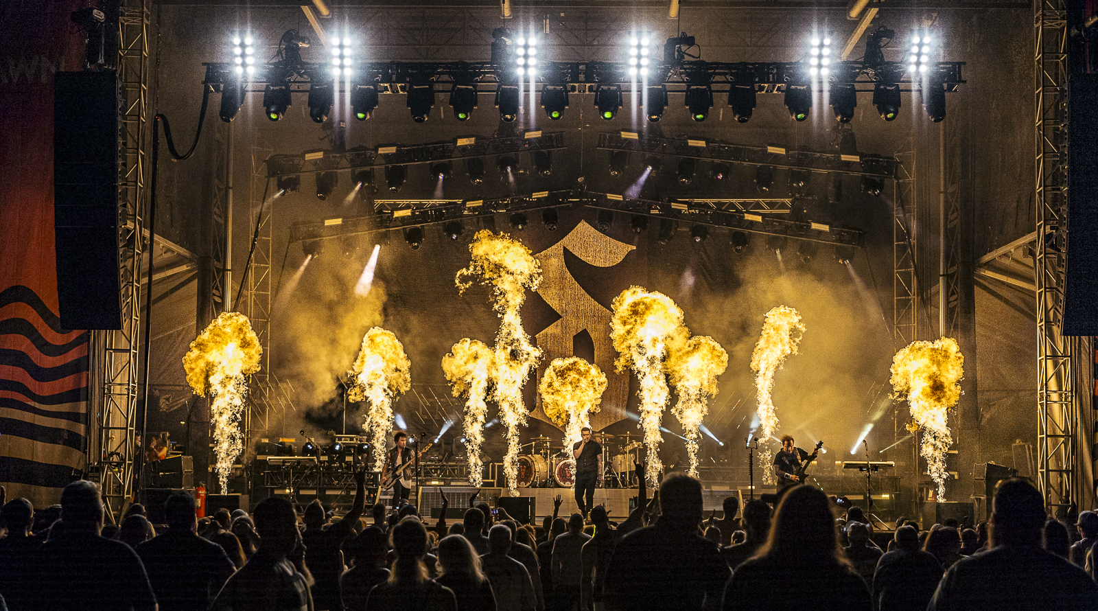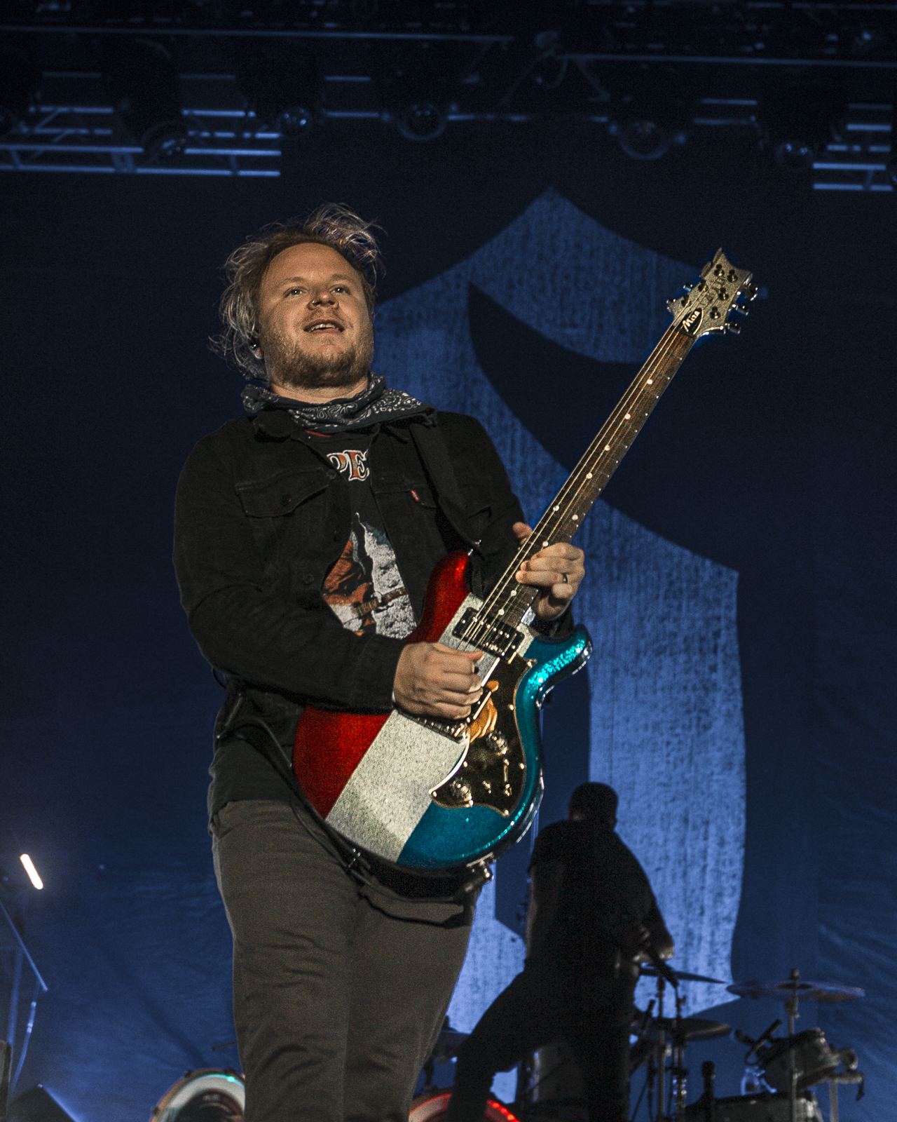 While scrambling to hit up the food trucks and drink stands the second band erupted onto stage. For the first time since shut down my horns instantly flew in the air as “Deal with the Devil” from their 2013 album Onyx vibrated through downtown Louisville. Founding member Leigh Kakaty greeted the crowd and thanking them for making the time to come out. He announced the next song is a new song, was very important, and we all should soak in the words. “Survivor” was as result of the pandemic and current world situations. It was a salute to those there to rock. The Pop Evil super fans sang every word. While those of us who hadn’t had the pleasure of hearing it, enjoyed a much needed come together song. With a relatively short setlist Pop Evil used every second to the max. The angsty mid-pandemic hit “Work” made me reflect on the past year and realize how lucky we all were to finally be enjoying hard rock again. Because let’s be honest, all most of us did last year was work. Chart topping hits “Footsteps” from the 2015 album Up and “Breath Again” from the 2018 self-titled album kept the crowd alive. “I can finally breath again” had a whole new meaning. One could celebrate having the current ability to be in public maskless, beating COVID, or just being able to take a deep breath because live music is back. Whichever was the case, everyone seemed to enjoy that song a tad bit more. By this time, the entire band was on fire.
