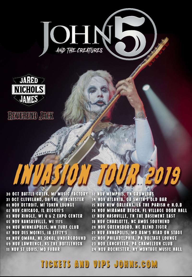 JOHN 5 and The Creatures is set to kick off the second leg of the Invasion Tour 2019 this week in Battle Creek, MI. Jared James Nichols, who supported JOHN 5 on the first leg of the Invasion Tour earlier this year, has once again been tapped to open along with additional support from Reverend Jack.
