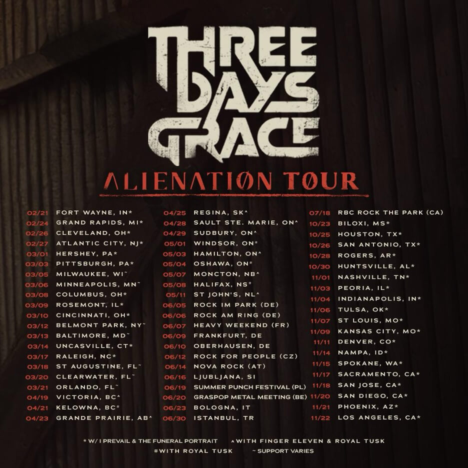 The multi-platinum Canadian rock band, Three Days Grace, is now on the road on the “Alienation Tour” throughout 2026. The tour is in support of their latest album, Alienation, which generated #1 hits in “Mayday” and “Apologies”. The US tour dates will receive support from I Prevail and The Funeral Portrait, Canada will see support from Finger Eleven and Royal Tusk on select dates, and Europe support acts announced shortly.